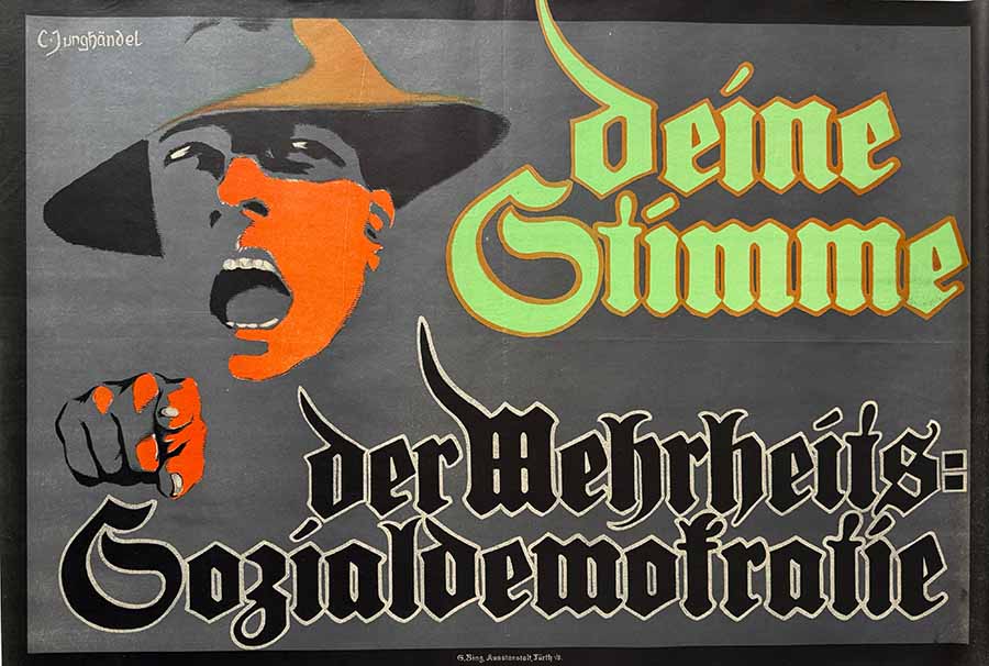 Nach dem Krieg spiegeln expressionistische Plakate den traumatisierten Zustand einer Nation. Die zunehmende Brutalisierung der politischen Auseinandersetzung in den 1920er und frühen 1930er Jahren zeigt sich auch in den drastischen Bildmotiven, besonders an den politischen Rändern. Mit der Machtübernahme der Nationalsozialisten endet schließlich die Vielfalt der politischen Stimmen im öffentlichen Raum.