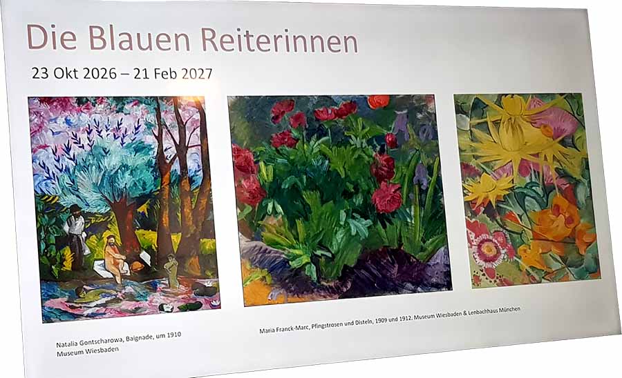 „Zwar wolle man nach dem höchst erfolgreichen wie turbulenten Jubiläumsjahr ‚200 Jahre Museum Wiesbaden‘ – zuletzt gekrönt durch das unerwartete Geburtstagsgeschenk des Swifties-Hypes um Friedrich Heysers Ophelia-Jugendstil-Bild – im Jahr 2026 wieder in den Normalmodus mit drei großen Ausstellungen plus Kabinettformaten zurückkehren, doch Museumsdirektor Dr. Andreas Henning und Dr. Roman Zieglgänsberger, Kustos Klassische Moderne, präsentieren beim heutigen Pressegespräch für 2026 bereits ein neues Ausstellungs-Highlight internationalen Ranges: ‚Die Blauen Reiterinnen‘.“Die Schau feiert am 23. Oktober 2026 im Museum Wiesbaden Weltpremiere. Ausgelöst durch die Entdeckung eines Schriftstücks um 2017/2018 konnte Zieglgänsberger belegen, dass es auch „Die Blauen Reiterinnen“ gab – eine Erkenntnis, die ihn fortan nicht mehr losließ.