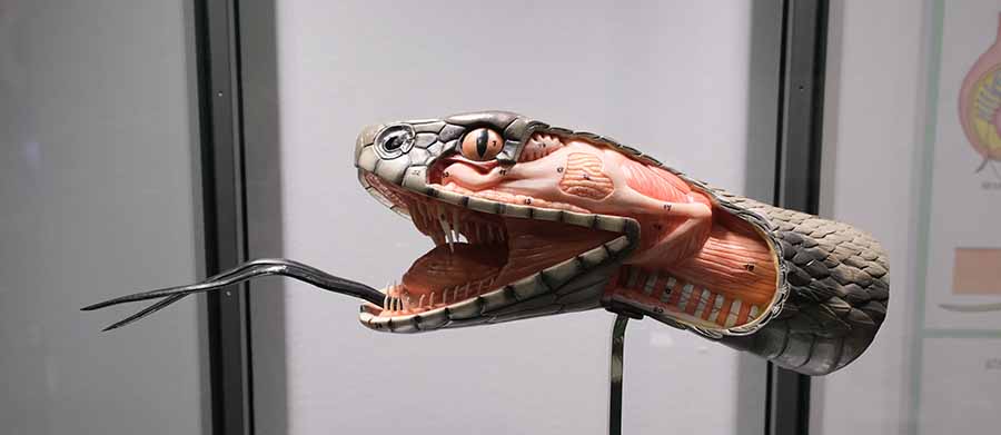 Im ersten Ausstellungsteil wird Gift als evolutionäre Überlebensstrategie betrachtet. Tiere, Pflanzen und Pilze nutzen toxische Substanzen zur Jagd, zur Verteidigung oder zur Täuschung. Neben bekannten Gifttieren wie Kobras oder Skorpionen begegnen Besucherinnen und Besucher auch überraschenden Beispielen: Der Plumplori, der einzige giftige Primat, schützt seine Jungtiere, indem er Gift in ihr Fell einreibt. Das Schnabeltier wiederum besitzt einen Giftsporn, den ausschließlich Männchen bei Rivalenkämpfen einsetzen.