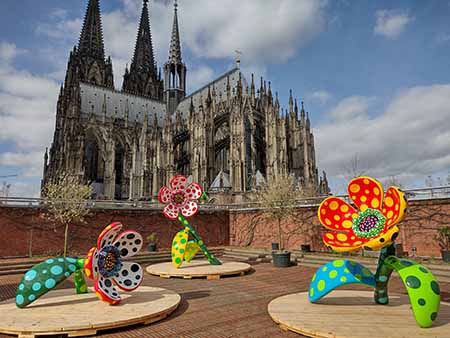 Die Ausstellung entstand in dreijähriger Vorbereitung in einer Zusammenarbeit zwischen dem Museum Ludwig, der Fondation Beyeler in Riehen bei Basel und dem Stedelijk Museum in Amsterdam, wohin sie im Anschluss wandert. Im Vergleich zu der Schau, wie sie bis Ende Januar in Riehen lief, zeigt das Museum Ludwig noch mehr Arbeiten auf Papier und einige weitere Skulpturen wie etwa drei große, farbenfrohe Blumen aus Bronze auf der Dachterrasse des Museums, und die Installation „Infinity Mirrored Room“ entfaltet im größten Raum des Museums Ludwig noch einmal eine andere beeindruckende Wirkung.