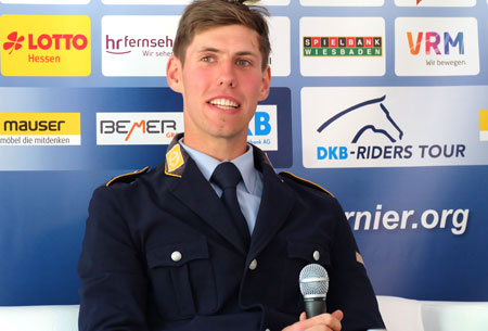 Jérome Robine, stammt aus Darmstadt, Sohn des hessischen Vielseitigkeits-Meisters Dr. Frank Robine und heute Gewinner des U25-Förderpreises Vielseitigkeit in Wiesbaden. „Ich war die letzten zehn Jahre zum Zugucken hier“, erzählt der 20-Jährige. „Am Anfang habe ich noch gedacht: ‚Oh Mann, ist das hoch‘, aber jedes Jahr ist man etwas näher herangerückt und irgendwann dachte ich: ‚Wäre ja cool, auch mal hier mit zu reiten.“ Das hat er getan und die U25-Wertung gewonnen. „Das ist schon etwas ganz besonderes!“ Viermal war Jerome Robine schon bei einer Nachwuchs-EM am Start, brachte die Bronzemedaille als 16-Jähriger mit nach Hause und gewann zweimal Teamgold. Nach seinem Abitur wollte er eins: Reiten. So ist er nun an der Bundeswehrsportschule in Warendorf, reitet und fühlt sich „allerbestens betreut“. Sein Erfolgspferd Quaddeldou ist ein Familienprodukt, selbst gezogen und ausgebildet. Der Erfolg heute somit ein Familienerfolg von der Pferdesport-Familie Robine.