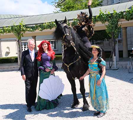 Spanische Magie: Das Showteam Mirage Español bringt drei edle Schimmelhengste in den Schlosspark. Begleitet wird es von Lisca Llorca, einer französischen Live-Malerin, die ihre Kunstwerke inspiriert von Pferd und Atmosphäre direkt vor Ort auf riesigen Leinwänden entstehen lässt. Diese werden noch am selben Abend für den guten Zweck versteigert – zugunsten des therapeutischen Reitens.