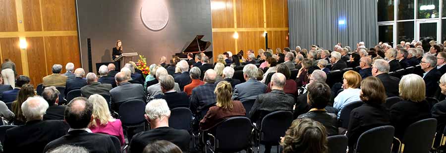 In ihrem Festvortrag „Eine Skizze zu keinem Familienroman“ zeichnete die vielfach ausgezeichnete Georg-Büchner-Preisträgerin Dr. Ursula Krechel im Kontext von Exil, Flucht und dem Schicksal der Frankfurter jüdischen Kaufhausfamilie Wronker ein eindringliches – und zugleich warnendes – Bild der Zerstörung großbürgerlicher Existenzen aus rassistischem Wahn seit den 1930er-Jahren.