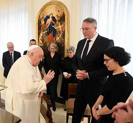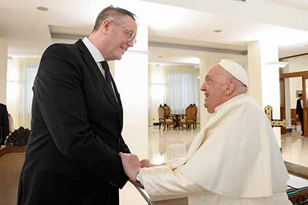 Der Heilige Vater hat Ministerpräsident Alexander Schweitzer an seinem Wohnsitz, der Casa Santa Marta, empfangen. Nach dem Vier-Augen-Gespräch sagte Ministerpräsident Alexander Schweitzer: „Wir haben sehr intensiv auch über die vielen Kriege gesprochen und wie wichtig Bemühungen um Frieden sind. Papst Franziskus liegt die Weltkirche sehr am Herzen und er machte deutlich, wie wichtig ihm Mitmenschlichkeit und der Einsatz für soziale Gerechtigkeit sind. Die Sorgen und Nöte der Menschen berühren ihn zutiefst. Ich bin beeindruckt, wie gut der Papst über die Situation in Deutschland informiert ist. Das Gespräch mit ihm war eindrucksvoll, tief und auch ermutigend. Es wird mir immer in lebendiger Erinnerung bleiben.“