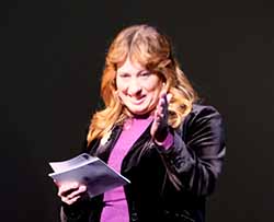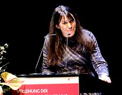 Ich freue mich, mit dem Preis ausgezeichnet zu werden, der den Namen des größten Komödiendichters der Deutschen trägt, Carl Zuckmayer. Danke schön!“