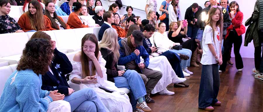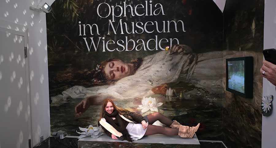 Schon früh am Tag hatten sich viele Besucherinnen und Besucher vor dem Museum und vor dem großen Ophelia-Plakat getummelt und fotografieren lassen. Unter ihnen war auch Jonny, HR3-Morgenmoderator, stets auf der Suche nach O-Tönen. Er hatte sich als Ophelia verkleidet – ganz in Weiß, mit einem Blumenkranz im Haar, „jederzeit zum Sterben bereit“, wie er scherzte. In der Hand hielt er statt Gänseblümchen dunkle Weidenzweige. Auf Bitten posierte er mit beseeltem Blick vor dem Ophelia-Plakat, später auch mit Fans in der Selfie-Ecke im Foyer, wo er immer wieder fürs Foto „dahinschied“, nur um gleich darauf wieder aufzuerstehen.