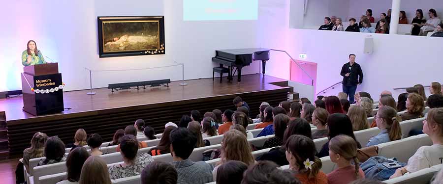 Das Museum Wiesbaden griff diese Symbolik auf und schmückte das Vortragspult mit einem überdimensionalen „Freundschaftsband“, verziert mit Herzchen und der Aufschrift „MUWI“ (für Museum Wiesbaden).