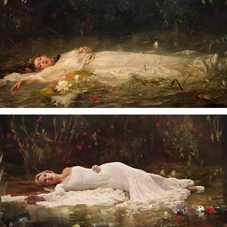 Oben original Jugendstilgemälde Ophelia von Friedrich Heyser um 1900. Darunter Taylor Swift als Ophelia in ihrem Musik Video © Foto Diether von Goddenthow