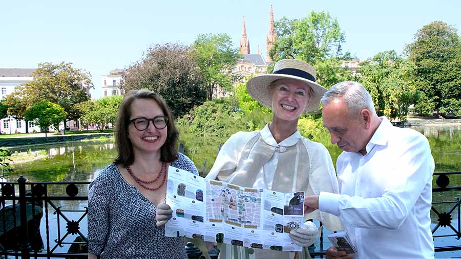 (v.li.:) Dr. Vera Klewitz, Kuratorin der Sammlung Naussauische Altertümer am SAM, Gerda Otto, Darstellerin, sowie Dr. Peter Forster, Stellvertretender Direktor des Museum Wiesbaden und Kustos moderne und zeitgenössische Kunst, präsentieren und erläutern die Funktionsweise des neuen Taschenfaltplan „Jugendstil-Pfad Wiesbaden“, © Foto Diether von Goddenthow