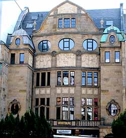 Folgt man dem Faltplan, beginnt der mehrstündige Rundgang mit  der „Wartburg“, Station 1. Das markante Gebäude, heute teilweise vom Hessischen Staatstheater genutzt und im Erdgeschoss gastronomisch belebt, beeindruckt mit seiner hellen, geschwungenen Sandsteinfassade – für manche vielleicht etwas wuchtig. Errichtet wurde es 1906 im Auftrag des Wiesbadener Männergesangvereins. Über dem zweiten Geschoss verläuft ein fünfteiliger Relieffries, der den berühmten Sängerwettstreit aus der Tannhäuser-Sage darstellt. Gefertigt wurde dieses Werk von der Wiesbadener Firma Höppli.