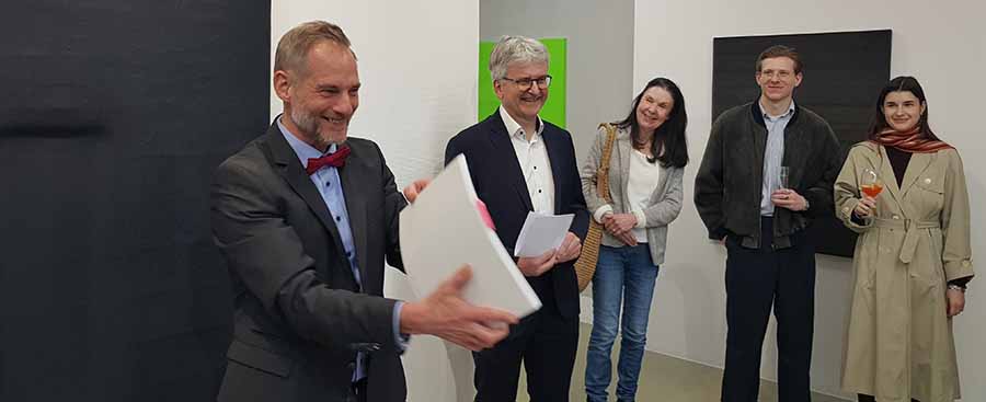 Mit „Balance“ zeige Marie-Luise Gruhne eine spannende Auswahl ihrer auf „ein“ Portal oder einen Torbogen reduzierten monochromen Bildformate. Ausgangspunkt ihrer künstlerischen Formbildungsprozesse sei, so der Laudator, „eine Grundform, die das Prinzip der Dauer und Stabilität über das menschliche Sein hinaushebt und als solches in seiner grundsätzlichen Arche widerspiegelt“. Gruhne verstehe sich nicht einfach nur „als eine Künstlerin des Moments, also der Aktualität, sondern durchaus als Teilhaberin einer bis in die Anfangszeit menschlicher Gemeinschaft zurückreichenden Auffassung künstlerischer Tätigkeit.“ Sei es eine Zeichnung, ein Gemälde, eine künstlerische Fotografie, eine Videoarbeit, eine Installation oder auch eine Skulptur, so Müller: Am Ende diene die Kunst damit doch einem tief sitzenden, auch anthropologischen, in die Zeit von 50.000 bis 60.000 Jahren vor unserer Zeit zurückreichenden Bedürfnis des Menschen, nämlich „der Flüchtigkeit, Vergänglichkeit, ja Sterblichkeit aller äußeren Erscheinungen, aber auch der tiefen Verunsicherung und Entwurzelung des Menschen in allen Zeiten zu begegnen“, was der Laudator mit einem Zitat untermauerte: „Ich, Marie-Luise Gruhne, suche nach etwas Dauerndem und finde es dort, wo es unserer Existenz als Bedingung zugrunde liegt. So fühle ich es in dem Moment, wenn tragende und lastende Kräfte sich so ergänzen, dass Stabilität entsteht, wenn also etwas im Gleichgewicht ist – sichtbar und fühlbar für mich.“ Die Form, die dieses Gleichgewicht und diese Stabilität der tragenden und lastenden Kräfte in geradezu kongenialer, also äußerst passender Weise zum Ausdruck bringe, so Müller, sei „ein Tor, ein Portal oder auch ein antikes Tempelportal, aber auch – und das ist für Dich ebenfalls wichtig – die Form jungsteinzeitlicher torartiger sog. Trilithen von Stonehenge oder der Tore in der präkolumbischen Ruinenstadt Tiwanaku“.