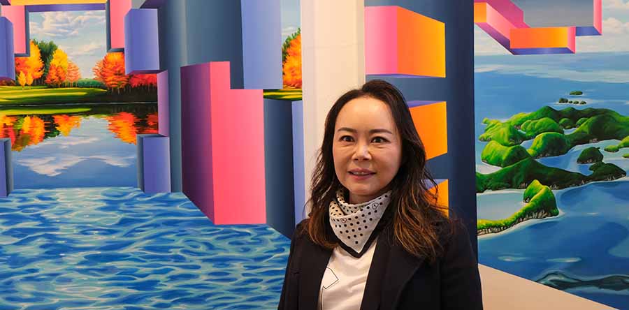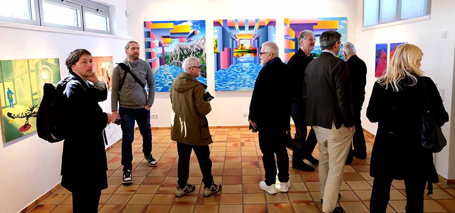 Dr. Irene Haas zeigte sich außerdem besonders erfreut, dass die koreanische Künstlerin SEO trotz Schwierigkeiten im Luftverkehr rechtzeitig zur Vernissage nach Flörsheim anreisen konnte. Die 1992 in Gwangju (Südkorea) geborene Künstlerin kam nach ihrem Kunststudium nach Berlin und schaffte es mit großer Beharrlichkeit, bei Georg Baselitz an der Universität der Künste zu studieren, wo sie schließlich auch Meisterschülerin wurde. Ihre Arbeiten verbinden hyperrealistisch gemalte, oft digital entworfene Architekturen mit archaisch wirkenden Landschaften. In diesen kontrastreichen Bildwelten thematisiert SEO die Verfremdung des Natürlichen sowie die Spannungen zwischen digitaler Gegenwart und ursprünglicher Natur.