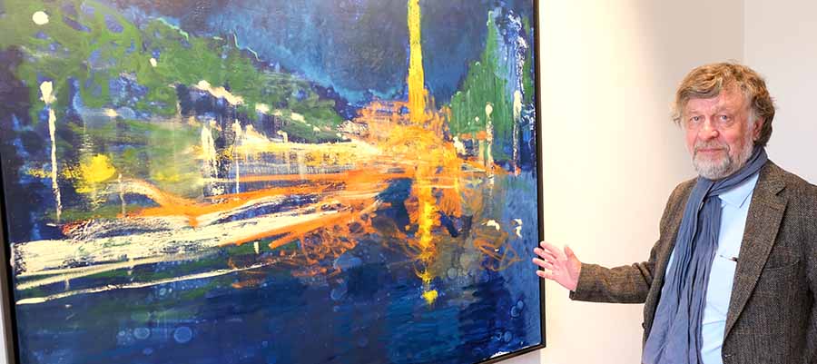 Haas stellte einige der präsentierten Künstler aus der Sammlung Haas van Gemmern vor. Einer der ersten Künstler, mit dem 2003 die Sammlung Haas van Gemmern begann, war Reinhard Stangl, der hier mit dem Werk „Der große Stern“ (2010) vertreten ist. Die Werke des Berliner Künstlers, so Haas, verbänden Figuration und Abstraktion und zeichneten sich durch farbreiche, vielschichtige Kompositionen aus. Er fühle sich der Tradition verpflichtet und habe zugleich eine eigenständige zeitgenössische Bildsprache entwickelt. Thematisch setze er sich mit Menschen, Alltagssituationen sowie Stadt- und Landschaftsbildern auseinander und zeige dabei ein feines Gespür für das Komische wie auch für das Tragische im Menschlichen.