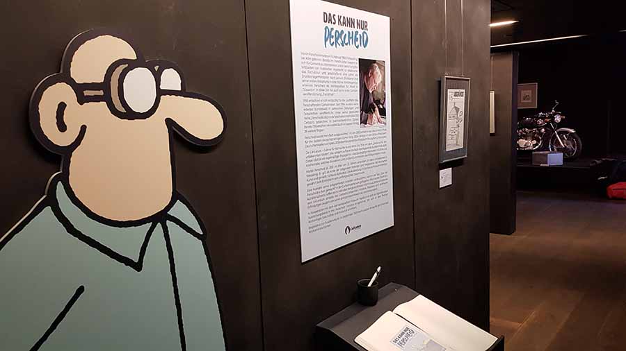 Die Ausstellung im Caricatura Museum Frankfurt zeigt Perscheids prägnanteste Werke, die den Ausstellungstitel „Das kann nur Perscheid“ unterstreichen und unter Beweis stellen. Die Schau zeigt auch eine andere Facette des Cartoonisten und präsentiert Modelle und technische Erfindungen Perscheids. Dass der Künstler ein leidenschaftlicher Motorradfahrer und -schrauber war, ist kein Geheimnis und zeigt sich in vielen seiner – auch in der Ausstellung gezeigten – Cartoons. So nimmt Perscheids geliebte und selbstrestaurierte Honda CB 450 (Jahrgang 1966) einen Ehrenplatz in der Ausstellung ein.