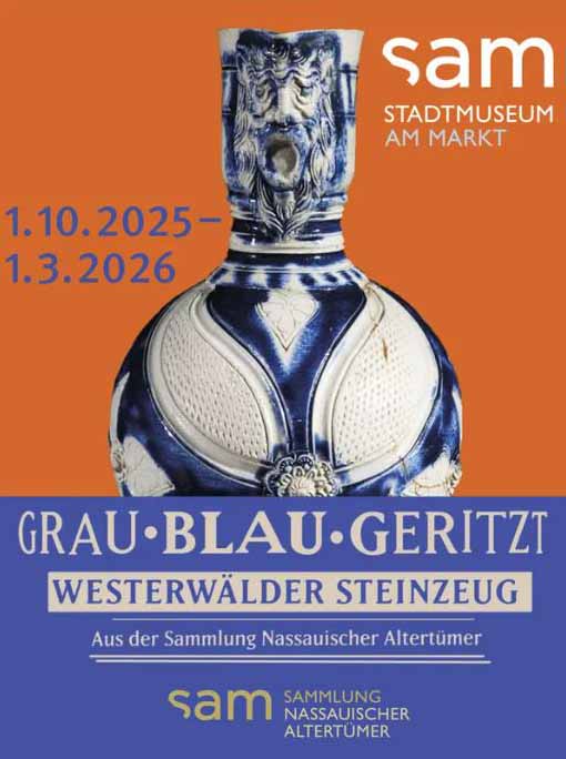 Nach der erfolgreichen Sonderausstellung „Nach dem Leben geformt. Hans Wewerka und das Westerwälder Steinzeug des Jugendstils“ im Frühjahr 2024 setzt das Wiesbadener Stadtmuseum am Markt (sam) mit der neuen Sonderausstellung „Grau, Blau, Geritzt“ vom 1. Oktober 2025 bis 1. März 2026 die Präsentation wertvollen Westerwälder Steinzeugs aus der Sammlung Nassauischer Altertümer fort.