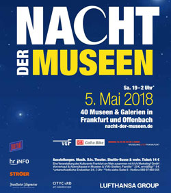 Wenn sich am 5. Mai die Nacht über die Stadt senkt, hebt sich in über 40 Kulturstätten in Frankfurt und Offenbach der Vorhang zur NACHT DER MUSEEN 2018. Bis zum Morgengrauen öffnen Museen, Galerien und Off-Spaces ihre Pforten – zu erleben gibt es Kunstgenuss für alle Sinne. Museumsfoyers und Ausstellungsräume verwandeln sich in außergewöhnliche Spielorte, die Wirkungskraft der Exponate wird durch Führungen, Performances, Live-Musik, Filmprojektionen und Lesungen ergänzt. Mit nur einem Ticket erhalten Nachtschwärmer Zutritt zu allen teilnehmenden Veranstaltungsorten und freie Fahrt mit dem NACHT DER MUSEEN Shuttle-Service (Busse, Schiff, historische Straßenbahn, Bikesharing).