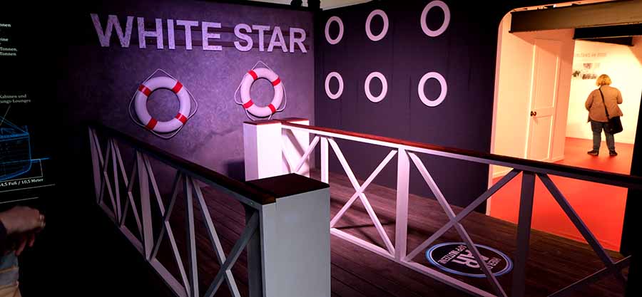 Die Ausstellung besteht aus sechs Bereichen: Im Foyer checken die „Passagiere“ über den „Hafeneingang“ des Hafens von Southampton in der dritten Klasse ein und erfahren über Infotafeln Hintergrundwissen vom „Leben an Bord“ bis hin zu bewegenden Biografien ehemaliger Passagiere. Zudem kann man sich per KI-Fotospot fotografieren und ins Jahr 1912 „animieren“ lassen.