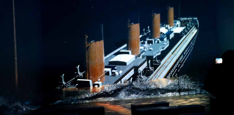 Derart angeturnt, betreten Besucher die alle 30–40 Minuten präsentierte immersive Titanic-Untergangs-Show an Bord des Luxusliners. Sie durchlaufen vom Stapellauf, Check-in und Leben an Bord bis hin zum Untergang in einer 360-Grad-Projektion den Untergang des Schiffes in der Nacht vom 14. auf den 15. April 1912: Ein gigantischer Schiffsrumpf thront majestätisch am Pier, Matrosen laufen eilig umher, und unter die rauen Rufe der Seeleute mischt sich das aufgeregte Gemurmel der Passagiere. Es ist der 10. April 1912, und im Hafen von Southampton herrscht reges Treiben. Die RMS Titanic, ein Wunderwerk der Technik und das damals größte Schiff der Welt, bricht zu ihrer Jungfernfahrt Richtung New York auf. Die RMS Titanic ist ein Versprechen und eine Hoffnung – auf Fortschritt, Luxus und eine bessere Zukunft. Niemand ahnt, dass der legendäre Ozeanriese unaufhaltsam seinem dramatischen Schicksal entgegensteuert. Bekanntermaßen rammte nur vier Tage nach dem Ablegen das vermeintlich unsinkbare Titanic einen Eisberg und versank mit über 2000 Passagieren und Seeleuten im eiskalten Atlantik. Da in den wunderbar gestalteten Szenen die Ereignisse eher nur angedeutet bleiben und mit viel Symbolik auskommen, lösen sie – anders als bei einem reinen Action-Spektakel – keine Herzrhythmusstörungen aus und sind so für Kinder und sensiblere Gemüter wirklich aushaltbar.