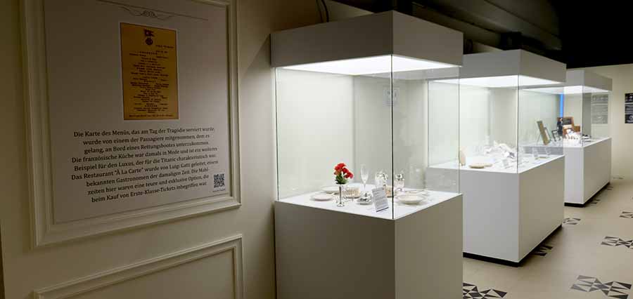 Es schließt sich ein kleiner Artefakte-Raum mit Original-Exponaten (aus einem Schwesterschiff) an, die den außerordentlichen Luxus an Bord des einst größten Passagierschiffs der Welt, der Titanic, vermitteln.