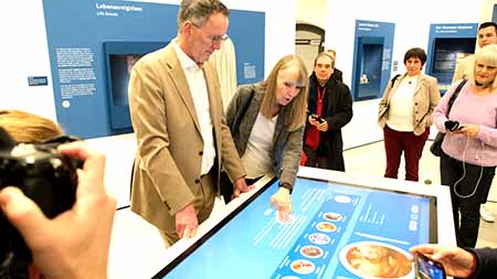 Innenminister Michael Ebling und Museumsdirektorin Dr. Birgit Heide im Ausstellungsbereich Jüdische Feiertage, Lebensereignisse und Alles koscher, bei einer digitalen koscheren Menü-Auswahl. © Foto Diether v. Goddenthow