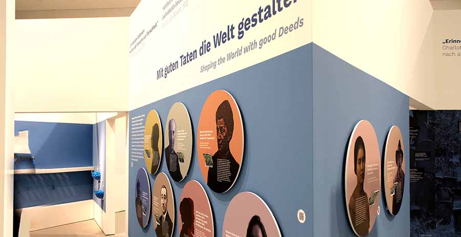 Eine der Sternspitzen: rechts geht es zu „Auf das Leben – Jenseitsvorstellungen im Judentum“, links in den Ausstellungsbereich: „Engagieren“ – „Mit guten Taten die Welt gestalten“, „Gerechtigkeit üben“ und „Tikkun Olam – Die Reparatur der Welt“. © Foto Diether v. Goddenthow
