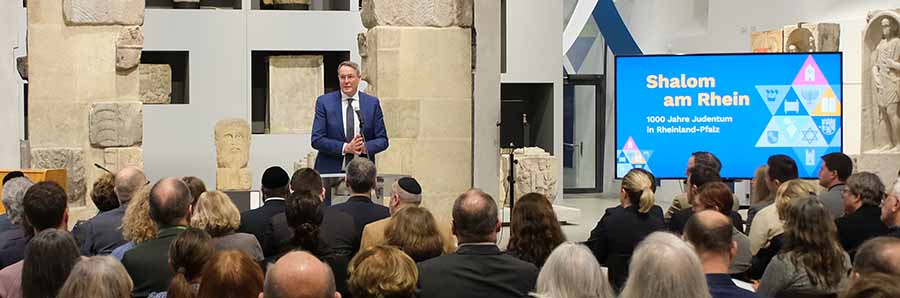 Die neue rheinland-pfälzische Landesausstellung „Shalom am Rhein. 1.000 Jahre Judentum in Rheinland-Pfalz“ wurde am 14. Januar 2026 feierlich in der Steinhalle des Landesmuseums Mainz von Ministerpräsident Alexander Schweitzer gemeinsam mit Innenminister Michael Ebling, GDKE-Generaldirektorin Dr. Heike Otto und Museumsdirektorin Dr. Birgit Heide eröffnet.