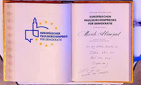 Masih Alinejad selbst sagte: „Es ist mir eine große Ehre, diese Auszeichnung und diese Anerkennung zu erhalten. Ich möchte diesen prestigeträchtigen Preis den mutigen Frauen und Männern widmen, die für einen freien Iran kämpfen, in dem Demokratie sowie Menschen- und Frauenrechte geachtet werden. Viele haben ihr Leben für diese Werte geopfert.“ Sie bedankte sich bei der Jury des Europäischen Paulskirchenpeises dafür, dass sie diese mutigen Frauen und Männer würdige und ehre. „Die wahre Auszeichnung wird die Einheit der demokratischen Länder mit den Freiheitskämpfern sein, um der Tyrannei ein Ende zu setzen“, sagte Alinejad, die sich nach der Preisverleihung noch in das Goldene Buch der Stadt Frankfurt am Main eintrug.