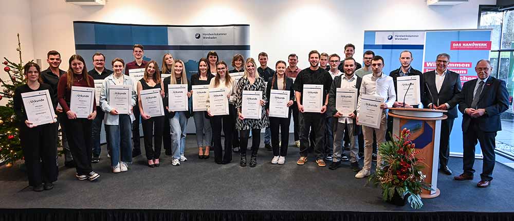 Die Handwerkskammer Wiesbaden hat 34 Gesellinnen und Gesellen aus dem Kammerbezirk für ihre herausragenden Leistungen bei der Deutschen Meisterschaft im Handwerk – German Craft Skills 2025 (DMH) ausgezeichnet. Im Meistersaal überreichten Kammervizepräsident Joachim Wagner und Wiesbadens Oberbürgermeister Gert-Uwe Mende den erfolgreichen Nachwuchskräften Urkunden, Geldprämien und Geschenk-Gutscheine.