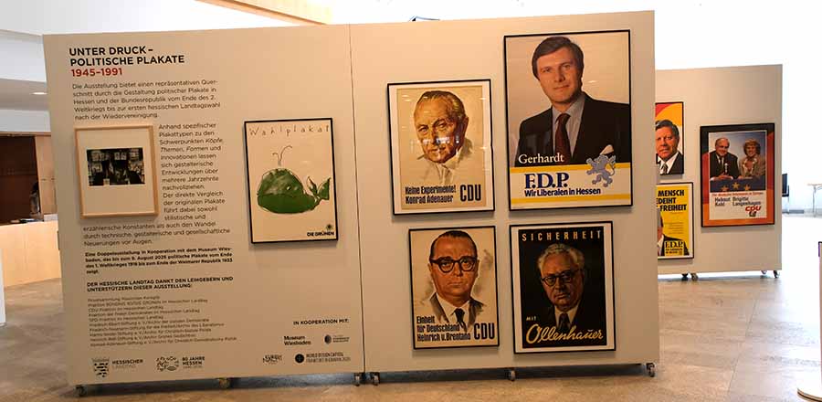 In Zusammenarbeit mit dem Museum Wiesbaden und im Rahmen „80 Jahre Hessen“ zeigt der Hessische Landtag ab 18. März 2026 im Foyer die Ausstellung „Politische Plakate 1945–1991“ und präsentiert damit den zweiten Teil der Schau „Unter Druck – Politische Plakate 1918–1933“. Ausgangspunkt der Ausstellung ist die Frage: Was ist überhaupt ein Wahlplakat? In den nach folgenden Sparten geordneten Bereichen „Köpfe“, „Themen“, „Formen“ und „Innovationen“ zeichnet sie die Entwicklung politischer Plakatgestaltung in Deutschland vom Ende des Ersten Weltkriegs bis zur ersten Landtagswahl in Hessen nach der deutschen Wiedervereinigung 1991nach. Dabei wird nicht nur die Geschichte eines grafischen Mediums erzählt, sondern zugleich ein Überblick über mehr als siebzig Jahre deutscher Politik- und Gesellschaftsgeschichte gegeben. Die Plakate spiegeln politische Konflikte, Ideologien und gesellschaftliche Stimmungen ihrer jeweiligen Zeit wider. Die Ausstellung ist ein Projekt es World Design Capital 2026.