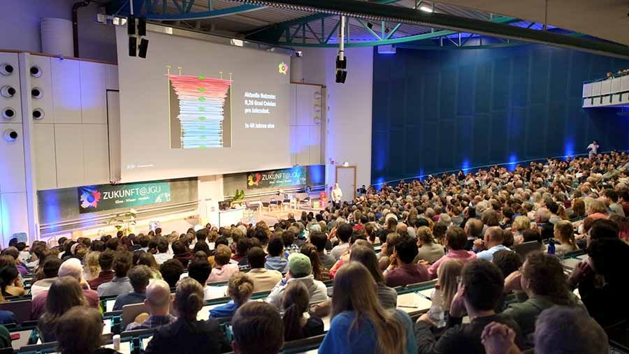 Blick in der Hörsaal der Auftaktveranstaltung 2024 zur Vorlesungsreihe: VISIONS FOR CLIMATE an der JGU Mainz © Foto Diether von Goddenthow