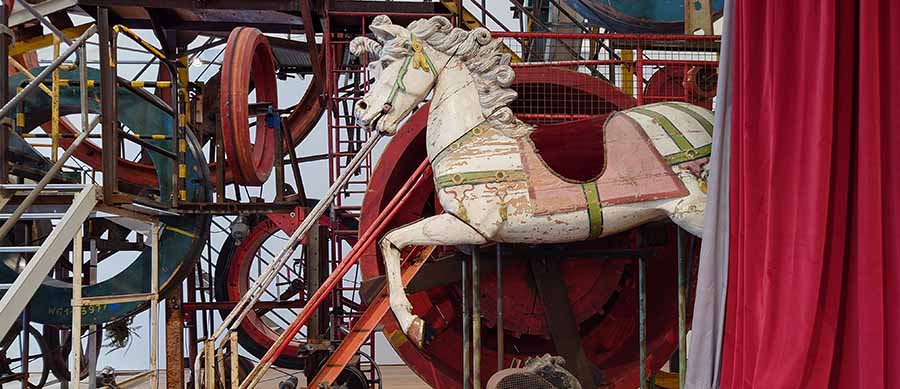Nun ist er frei, die kinetische Kunst auf ein neues Niveau zu heben. Das Rad ist sein A und O, Tempo zentrales Tinguely-Thema. Er liebt flotte Schlitten, richtet seinen Terminkalender nach der Formel 1 aus – und wird schon mal den Führerschein los. Derweil findet der unter anderem von Alexander Calder beeinflusste Bildhauerrebell Gefallen auch an nur einem 1PS: Gern verbaut er Teile historischer Karussellpferde.