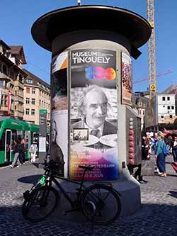 Dasselbe wollen die beiden Schweizer Städte, die mit dem charismatischen Künstler, der alles, bloß keinen Stillstand ertrug, eng verbunden sind: Für den Jubilar konzipieren sie Stadttouren; Basel, das Rundgänge zu Paracelsus oder Erasmus schon längst anbietet, zum ersten Mal überhaupt. „Vom Dekorateur zum Künstler – Das bewegte Leben Jean Tinguelys“ wird rund um seinen Fasnachtsbrunnen vertieft. In Fribourg geboren, schnuppert Tinguely in die Globus-Filiale am Basler Marktplatz für eine Lehre zum Schaufensterdekorateur. Ein Fehlstart. „Der junge Mann macht ständig Dummheiten“, empört sich Globus in einem Einschreiben an dessen Vater im Februar 1942, „er beschädigt Dekorationsmaterial…sogar absichtlich“. 1943 wird der junge Mann gefeuert, beendet die Lehre bei einem unabhängigen Dekorateur und besucht die Gewerbeschule Basel, wo er mit moderner Kunst bekannt wird.