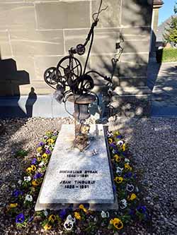 In der französischen Hauptstadt lernte Tinguely 1955 Niki de Saint Phalle kennen, 1971 heiratete er die Schöpferin der weltberühmten kultigen „Nana“-Figuren, mit der er seit 1960 zusammenlebte. Saint Phalles Enkelin Bloum Cardenas verwaltet den Nachlass von Tinguely und ihrer Großmutter. Niki de Saint Phalle pflegte zu allen Tinguely-Frauen Kontakt, über sie soll Tinguely auch seine letzte Geliebte kennengelernt haben: die bulgarische Künstlerin Milena Palakarkina, geboren 1959. Fünf Monate nach seinem Tod wird 1992 der gemeinsame Sohn Jean-Sébastien geboren. Er schlug ebenfalls die Laufbahn eines Künstlers ein, studierte in Düsseldorf und Zürich, macht aktuell Karriere und bekennt: „Ich habe meinen Vater nie physisch kennengelernt, aber ich erkenne mich in ihm wieder.“ Der Vater ruht derweil nicht wirklich in Frieden. Motorenlärm begleitet ihn nonstop: Der Kirchhof von Neyruz liegt direkt an der Hauptverkehrsstraße: Dem Autofreund Tinguely müsste das, so möchten wir annehmen, sehr behagen.