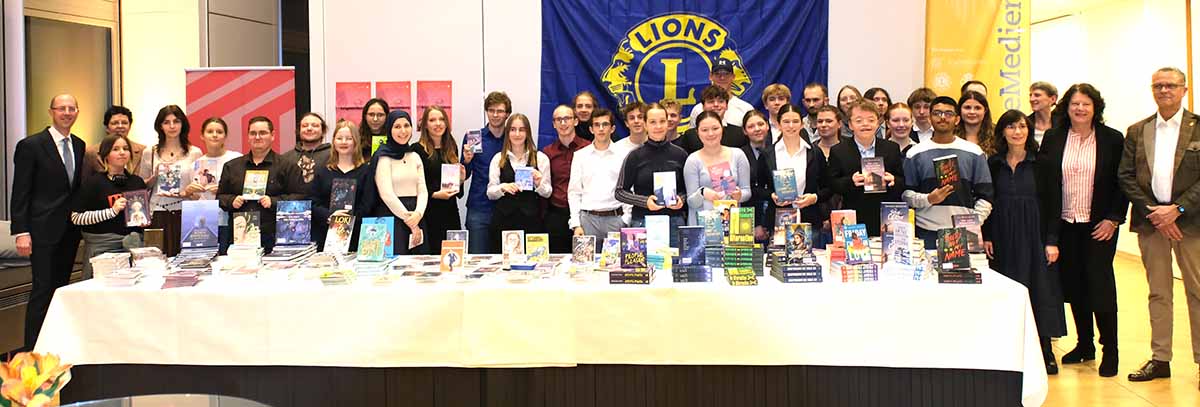 Übrigens gelangen alle Titel des „JungeMedienJury“-Wettbewerbs in den Bestand der Frankfurter Stadtbücherei und stehen dort zur Ausleihe zur Verfügung. Sämtliche Titel hatten die Jugendlichen liebevoll auf einem großen Tisch am Ende des Saals präsentiert, wo auch das Abschlussfoto entstand, bevor das Buffet eröffnet wurde und sie gemeinsam mit rund 100 Gästen ihre erfolgreiche Arbeit und Präsentation feiern konnten.