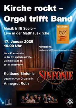 Am Samstag, 17. Januar 2026, wird die Evangelische Matthäuskirche Wiesbaden zur Rockbühne: Unter dem Motto „Kirche rockt – Orgel trifft Band“ begegnen sich ab 19 Uhr Orgelklang und Bandpower. Die Wiesbadener Kultband SINFONIE um Frontmann Michael Stein trifft auf die Kirchenorgel, gespielt von Annegret Roth.