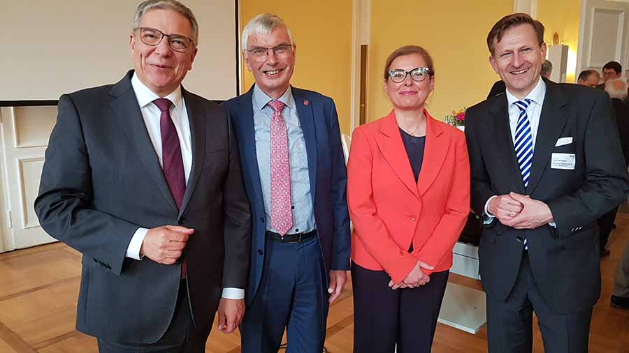 (v.li.) Oberbürgermeister Gerd-Uwe Mende, Prof. a. D. Dr. med. Dipl.-Mus. Eckart Altenmüller von der Medizinischen Hochschule Hannover, Univ.-Prof. Dr. Dr. med. Dagmar Führer-Sakel, Präsidentin der Deutschen Gesellschaft für Innere Medizin (DGIM), und Dr. Oliver Franz, DGIM-Geschäftsführer . © Foto: Diether v. Goddenthow.