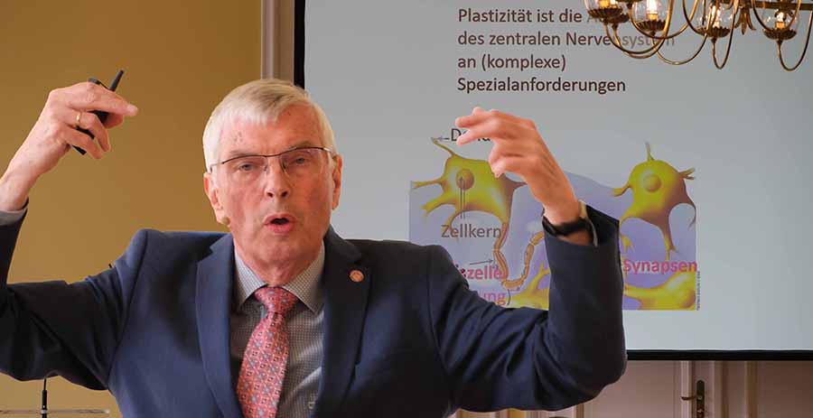Höhepunkt der Eröffnung des Patiententages war der Festvortrag von Prof. a. D. Dr. med. Dipl.-Mus. Eckart Altenmüller von der Medizinischen Hochschule Hannover. In seinem Vortrag „Apollos Gabe: die positiven Wirkungen von Musik auf Körper und Seele durch Neurohormone und Neuroplastizität“ gelang es ihm, wissenschaftlich hochkomplexe hirnphysiologische und hormonelle Zusammenhänge komprimiert und zugleich laienverständlich darzustellen.