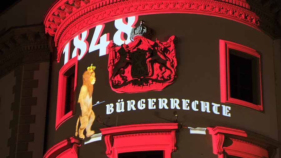 Das Lichterspektakel setzt im Jahr 1837 ein – in der Epoche der Herzöge von Nassau und mit dem Bau des Stadtschlosses. Bis heute lässt sich das prachtvolle Innere des klassizistischen Gebäudes bei einem Besuch im Landtag bestaunen. In der Illumination erscheint es in leuchtenden Ornamenten und fantastischen Fabelwesen, die der Hessenlöwe auf die schlichte Schlossfassade projiziert.