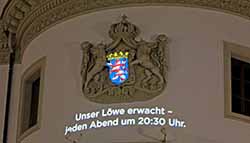 Die beeindruckende Lichtinstallation zeigt den zum Leben erweckten, fassadenkletternden steinernen nassauischen Löwen, der sich zum hessischen Wappenlöwen wandelt. Als visueller Moderator schlägt er auf der Schlossfassade 8 Minuten lang Kapitel für Kapitel der hessischen Landesgeschichte von 1945 bis heute auf und macht sie lebendig.
