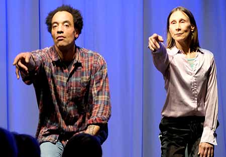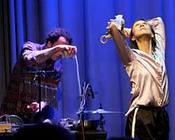 Die bereits mit dem Deutschen Buchpreis 2024 u. vielen weiteren Preisen bedachte Autorin bedankte sich herzlich mit einer Tanz-Performance gemeinsam inszeniert mit Klangkünstler Patrice LIPED. Hefter brachte körperlich zum Ausdruck, was ihre Texte vermitteln, während LIPED sehr empathische elektronische Klänge erzeugte und immer wieder auch komplementär und synchron Hefters Bewegungen spiegelte. Zwischendrin, in die Performance eingebaut, las Hefter immer wieder Passagen aus ihrem Buch, das sich mit „Love Scamming“, einer Art „Liebesschwindelei“ über das Internet befasst. Dabei versuchen junge afrikanische Männer, zumeist aus Nigeria, sich als reiche Westler ausgeben und mit unglaublichen Geschichten und Liebesschwüren, einsamen reiferen Damen auf Partnersuche um Geld zu bringen. Martina Hefters Protagonistin, durch die Pflege eines durch MS am Rollstuhl gefesselten Mannes völlig erschöpft, entdeckt nächstens diese Welt der Partnerbörsen und findet Lust am Thrill dieses Lügenspiels der Liebe, welches sie nun umdreht und ihrerseits die Liebesschwindler beschwindelt.