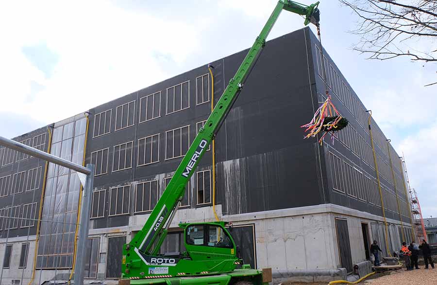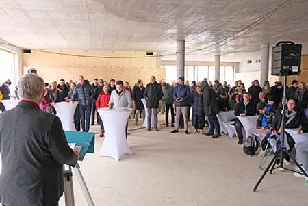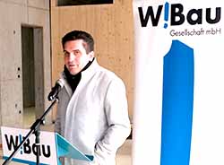 Andreas Guntrum, Geschäftsführer der „Wibau Wiesbaden“, zeigte sich bei der Begrüßung der Gäste – darunter Gerhard Obermayr (CDU), Vorsitzender der Stadtverordnetenversammlung, Schuldezernent Hendrik Schmehl (SPD) und Schulleiter Rainer Füll – gut gelaunt und betonte den hohen Stellenwert des Bauprojektes in Wiesbadens Schullandschaft. Aufgrund unvorhersehbarer Herausforderungen, unter anderem der Wiederholung einer Ausschreibung, kam es zu einem Zeitverzug von neun Monaten, bedauerte Guntrum. Zusätzlich habe die Hybrid-Bauweise des Gebäudes besondere Anforderungen mit sich gebracht. Während die beiden unteren Geschosse konventionell in Stahlbeton errichtet werden, entstehen die oberen drei Stockwerke in einer Holz-Hybridbauweise, so der SEG-Geschäftsführer. Hierzulande gäbe es jedoch noch wenig Erfahrung in dieser Bauweise, so dass die Besonderheiten für alle Beteiligten eine Herausforderung darstellten. Viele Details und Schnittstellen müssten neu gedacht werden. Häufig gäbe es noch keine standardisierten Bauteile, auf die zurückgegriffen werden könne. Dadurch gäbe es zum Teil auch keine allgemeinen Prüfzeugnisse. Vieles müsse daher individuell entwickelt und berechnet werden. Zum Beispiel konnte der genaue Wandaufbau erst nach Schallmessungen an einer Musterwand festgelegt werden, erklärte Guntrum die technischen Details.