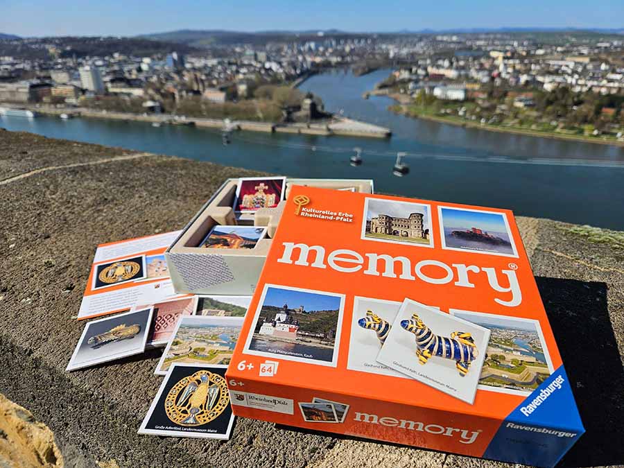 Ob als Geschenk, Souvenir oder spielerische Ergänzung zum Museumsbesuch – dieses Memory ist ein ideales Produkt für alle, die Rheinland-Pfalz und seine kulturellen Schätze lieben. Erhältlich ist das Original Ravensburger Memory Spiel für 16,95 € in den Museumsshops der Landesmuseen oder auch im Online-Shop unter www.gdke.rlp.de.