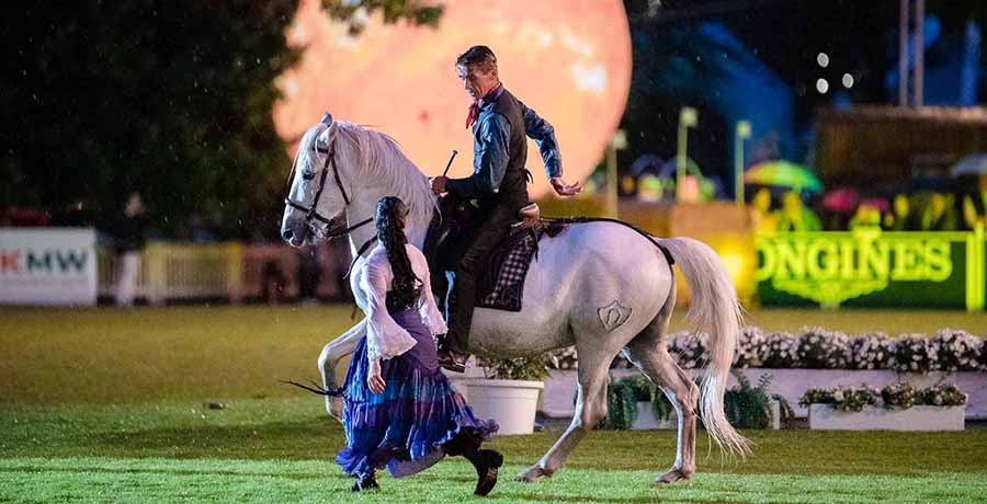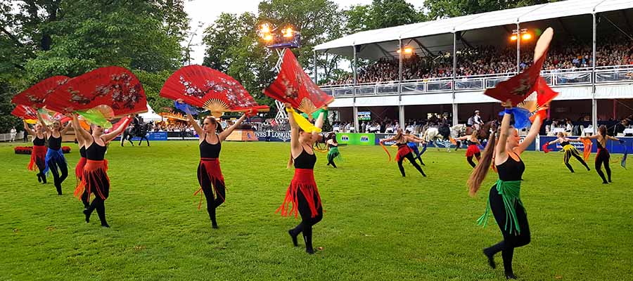 Gegen 23 Uhr fand die Pferdenacht ihren spektakulären Abschluss: ein großes Finale mit Feuerartisten, Windpferden, Feuerreitern, Stelzenläufern sowie musikalischen und tänzerischen Impressionen aus Disney-Musicals und erneut der Choreografie „Nah & Fern“.