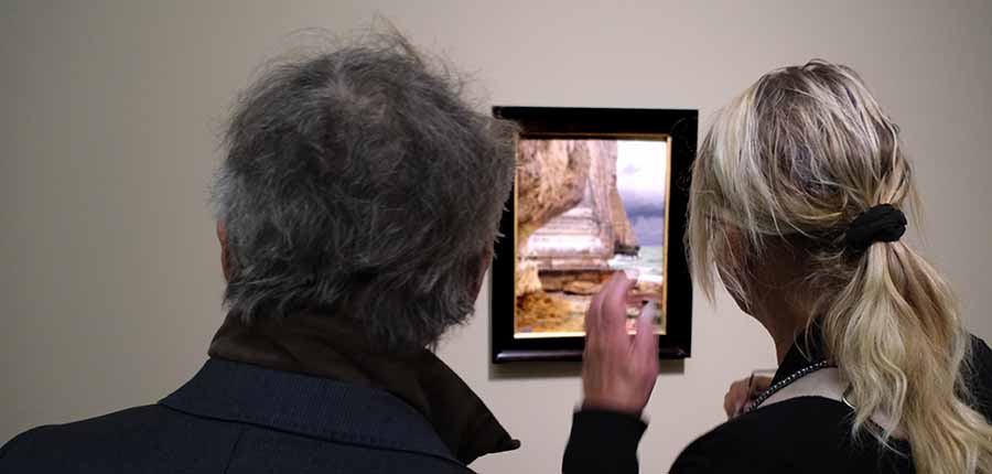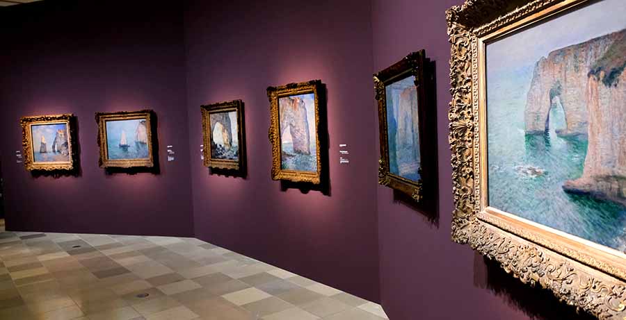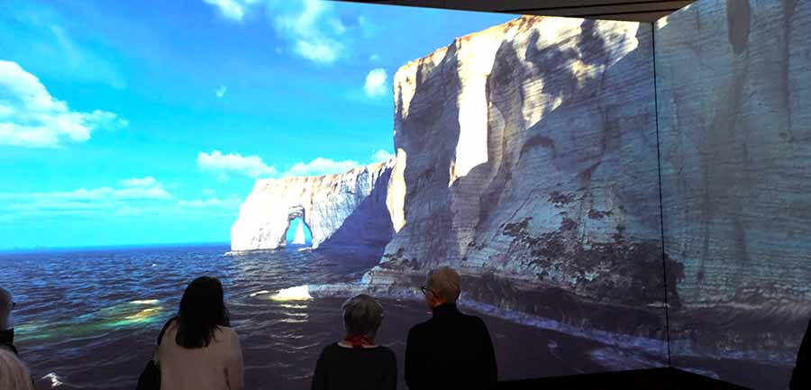 Einen wunderbaren Auftakt der Ausstellung bildet eine immersive Show auf Basis eines grandiosen dreidimensionalen Scans der Felsformationen der Bucht von Étretat. Sie lässt die Besucher rund 15 Minuten lang zur Einstimmung die Kreidefelsküste im Wechselspiel von Sonnenauf- und -untergang entlang der Küste fliegen. Produziert hat die Show das Pariser Unternehmen ICONEM, das auf die Digitalisierung von gefährdeten Kultur- und Naturgütern spezialisiert ist. Allein dieses Erlebnis wäre ein Museumsbesuch wert, insbesondere, wenn man weiß, dass seit Mai 2025 weite Teile der Kreidefelsen in Étretat, inklusive der berühmten Felsbögen und bestimmter Strandabschnitte, aufgrund akuter Einsturzgefahr und fortschreitender Erosion für Besucher gesperrt sind.