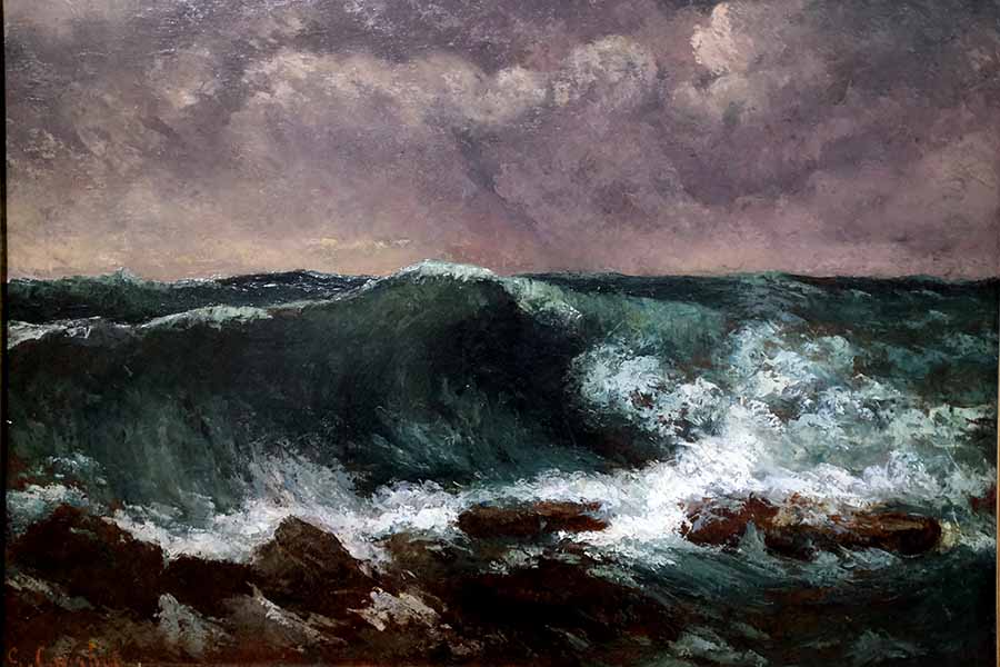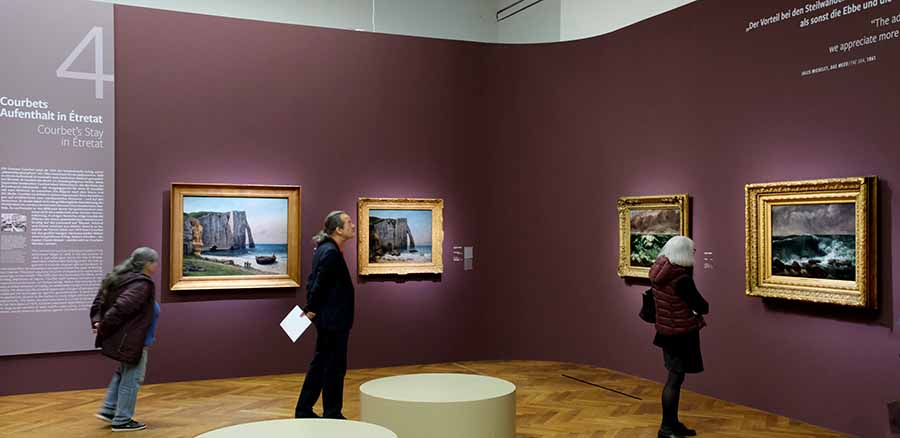 Den berühmten Wellenbildern von Gustave Courbet (1819–1877) ist in der Ausstellung ein eigener Raum 4 gewidmet. Ein Sturm, den der Künstler 1869 aus seinem Atelier in Étretat beobachtete, war Ausgangspunkt für eine Reihe von rund 20 Gemälden. In den Naturdarstellungen der Klippen und der rauen Wellen verzichtet Courbet sowohl auf erzählerische oder charakteristische Elemente des Ortes als auch auf die Darstellung der Bevölkerung. Er konstruiert bewusst eine künstlerische Realität, indem er den Bildraum durch Perspektivwechsel verfremdet oder verkürzt. Die Farbe trägt er nicht mit dem Pinsel, sondern mit dem Palettmesser auf – so entsteht eine raue, krustige Oberfläche, die mit den damaligen Regeln der akademischen Malerei bricht. Die beiden Gemälde mit dem Titel Die Woge aus der Städel-Sammlung (1869) und aus dem Musée des Beaux-Arts de Lyon (1869/70) sind herausragende Beispiele dieser Werkgruppe und werden durch weitere hochkarätige Leihgaben wie Felsen von Étretat (um 1869/70) oder Die ruhige See (1869) ergänzt. Im Pariser Salon von 1870 feierte Courbet mit diesen Motiven einen beispiellosen Erfolg. Nachfolgende Künstler – darunter Monet – sollten sich an Courbets Werken messen.