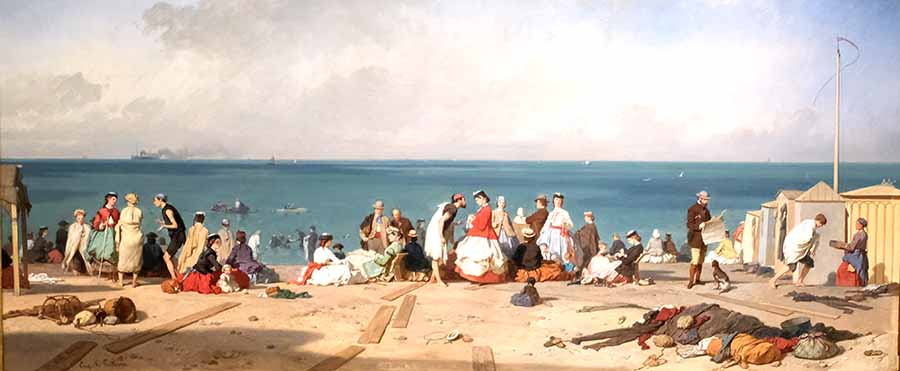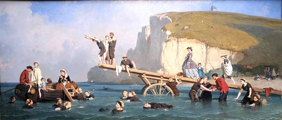 Zur gleichen Zeit machten reich illustrierte Reiseführer Étretat überregional bekannt, und die Küste entwickelte sich zu einem beliebten Ziel für Touristen. Eugène Le Poittévin (1806–1870) zeigte in seinem Panorama Seebad in Étretat (1866) den frühen Badetourismus und feierte mit seinen Gemälden im Pariser Salon große Erfolge, die Étretat vor allem beim städtischen Publikum populär machten. Le Poittévins Blick richtete sich auch auf den Alltag der Fischer, den er in romantisierenden Darstellungen wiedergab. Die Besucher finden seine Werke in Raum 7, zum Start dieses Ausstellungsteils im Ausstellungshaus.