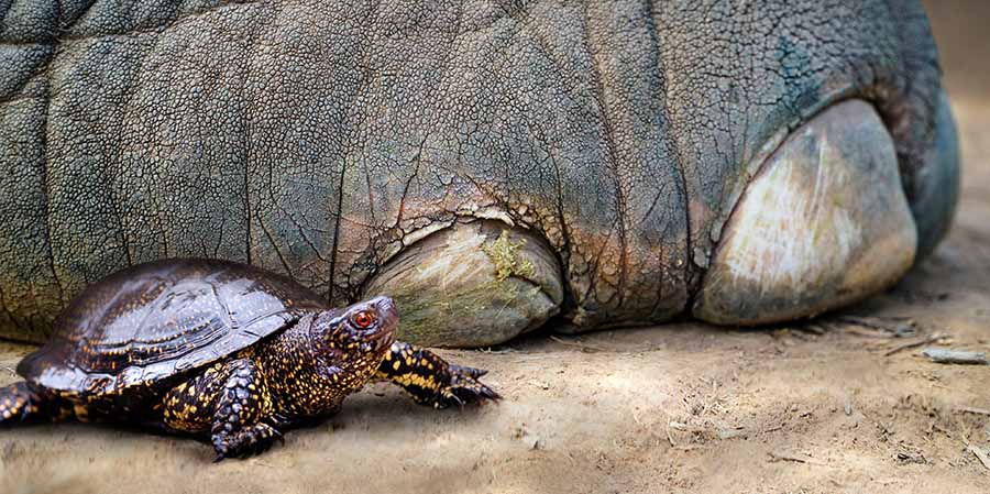 So könnte es vor rund 125.000 Jahren ausgesehen haben: eine Europäische Sumpfschildkröte (Emys orbicularis)neben dem Fuß eines Europäischen Waldelefanten (Palaeoloxodon antiquus) Abb./©: Nicole Viehofer/MONREPOS (LEIZA)