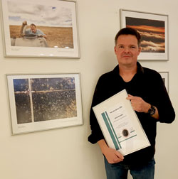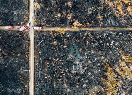 Doch Boris Rösslers PresseFoto symbolisiert viel mehr. Dies hat Matthias Haupt, Geschäftsführer der Sparkassen-Stiftung, in seiner Laudatio herausgearbeitet: „Boris Roessler hat seinem Foto eine klare Struktur gegeben. Ja, es wirkt gar aufgeräumt. Ein farblicher Kontrast gibt Orientierung, leitet den Blick. Wege treffen im rechten Winkel aufeinander. Alles ist an seinem Platz. Die Fahrzeuge stehen auf dem Weg, die Bäume sind ausgerichtet – wenn auch nicht vertikal, wie bei einem intakten Wald, sondern horizontal. Aber hier ist auch kein Wald mehr. Waldbrände werden in Deutschland meist durch Fahrlässigkeit oder vorsätzlich durch Brandstiftung verursacht. In wenigen Fällen sind Blitzeinschläge natürliche Auslöser. Schwere Waldbrände zerstören wertvolle Ökosysteme mit weitreichenden Folgen für Fauna, Flora und Umwelt. Ein Flächenbrand relativiert die Größe der technischen Hilfsmittel des Menschen. Ihre Ordnung geht verloren. Forstwege sind die Verkehrsachsen im Wald. Doch nach einem Brand und ohne Wald werden sie zum mahnenden Kreuz auf schwarzem Grund– wie auf dem Foto des Jahres 2022. Egal, welchen Blickwinkel man wählt!“