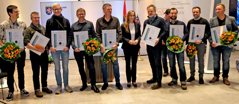 Während einer Feierstunde im Hessischen Landtag Wiesbaden ehrten gestern Abend Astrid Wallmann, Präsidentin des Hessischen Landtages, Matthias Haupt, Geschäftsführer der Sparkassen-Kulturstiftung, Knud Zilian, Vorsitzender des DJV-Landesverbandes Hessen und Heidje Beutel Vorsitzende DJV Thüringen, die diesjährigen Sieger des PresseFoto-Wettbewerbs der DJV-Landesverbände Hessen und Thüringen in den folgenden Kategorien: