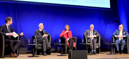Im Mittelpunkt der anschließenden Talkrunde mit Ministerpräsidentin Malu Dreyer, dem Präsidenten der IHK für Rheinhessen, Peter Hähner, dem Präsidenten der Landesärztekammer, Dr. Günther Matheis, sowie Joachim Rind, Präsident der Architektenkammer, standen Energie- und Klimakrise und die Frage, wie Wirtschaft und Politik damit umgehen.